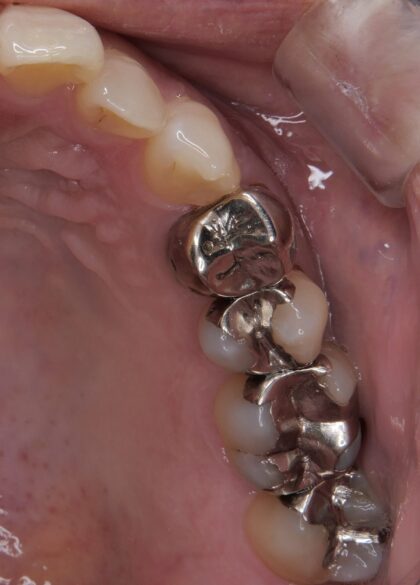 左上4(上顎左側第一小臼歯)に装着されていた保険診療の金属冠(FMC)を、e.maxクラウン(セラミック) にやりかえたケースです。