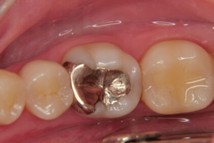 左下6(下顎左側第一大臼歯)にあったメタルインレーを白くしたいとの事でしたのでワンデイトリートメントにてe.maxインレー(セラミック) をセットしたケースです。